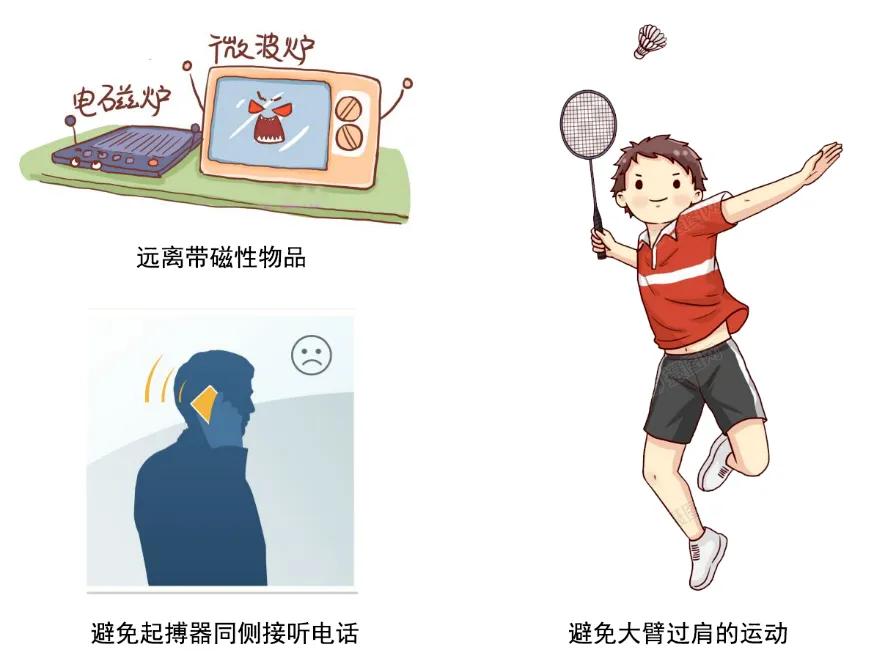 患者可正常使用手機,但通常建議不要將手機放置在植入起搏器側的上衣口袋,接、打手機應使用植入起搏器對側耳朵。不建議使用電磁爐和磁療儀,其他家用電器可放心使用。建議患者定期到醫院復查,至少一年一次。這樣可以觀察起搏器的電池用量以及功能是否正常。