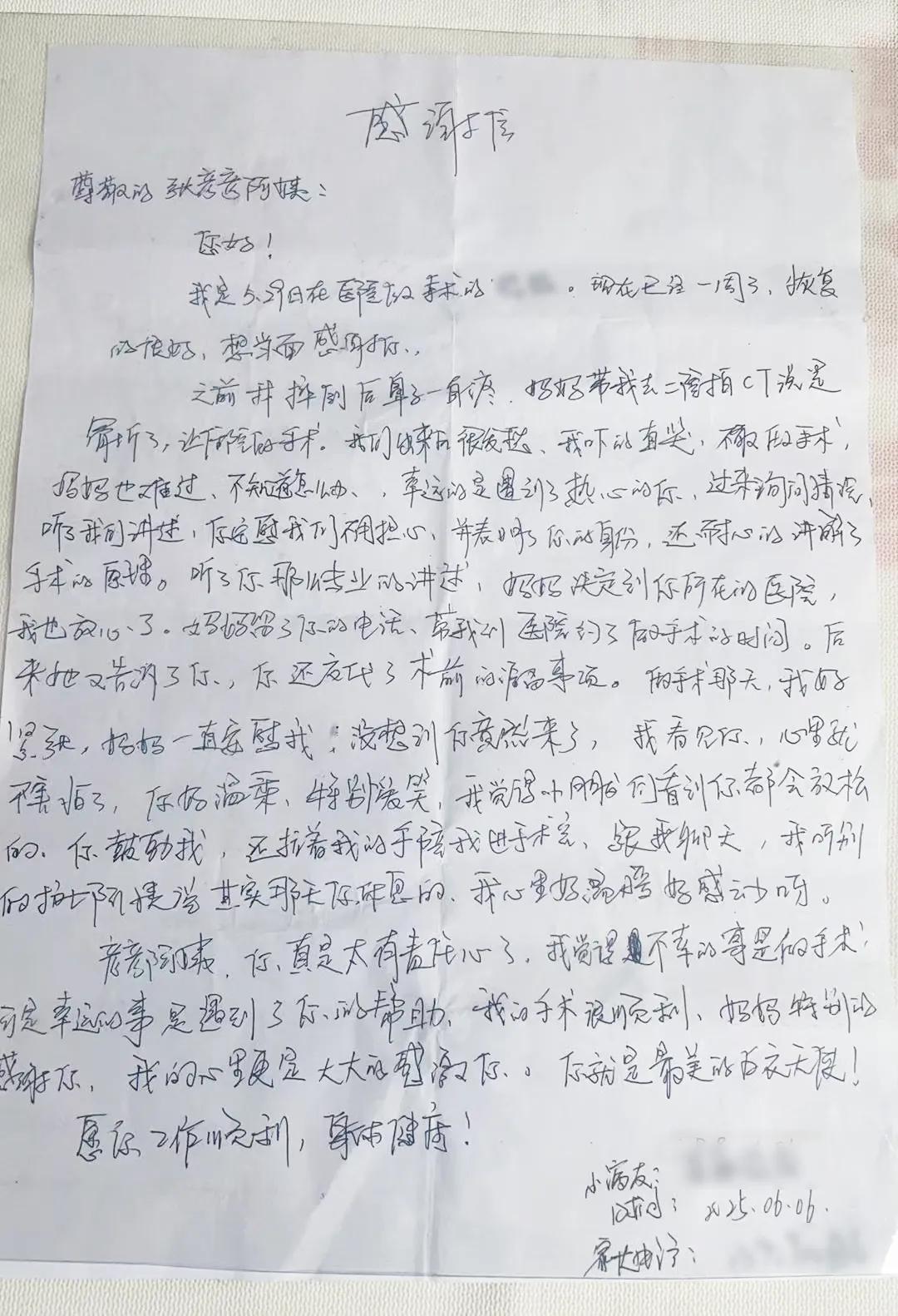 看似一個很平常的舉動,當(dāng)孩子媽媽告知孩子以后,小朋友在心底種下了感恩的種子,出院以后專程來醫(yī)院送來了這封感謝信......