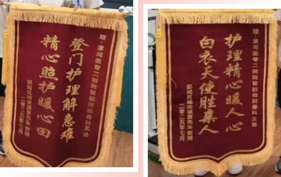 “真是太感謝孟冰和王露護士了,這兩面錦旗你們一定要收下!”7月16日,一名老年患者家屬將兩面錦旗送到了漯河醫專二附院(漯河市骨科醫院、漯河市立醫院)智能微創骨科護士站,再三感謝兩位護士上門為老人維護、更換導尿管。
