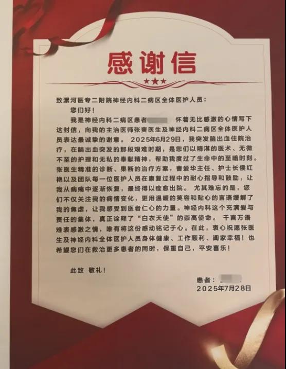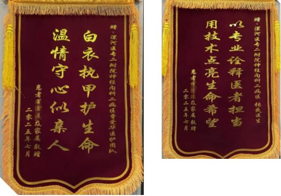 “你們不僅關注我的病情變化,更用溫暖的笑容和貼心的言語緩解了我的焦慮,讓我感受到醫者仁心的力量。”康復出院后,患者及家屬攜錦旗與感謝信再次來到醫院,他們把“以專業詮釋醫者擔當 用技術點亮生命希望”、“白衣執甲護生命 溫情守心似親人”這樣的贊譽送給醫護人員,表達著對醫護團隊的認可,也彰顯了醫院多學科聯合會診機制,院前急救、院內急診、院內救治全流程閉環管理的顯著優勢。