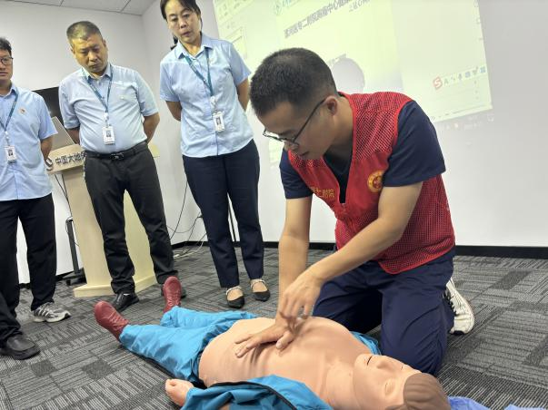 講座結束后,徐少奇醫生為大家進行現場演示,拆解CPR操作的全部流程,并現場設置實操環節,為大家進行指導,糾正“按壓位置錯誤”“力度不足”等常見錯誤,直至掌握正確的急救方法。演練現場氛圍熱烈,職工們都一一輪流進行現場實際操作。