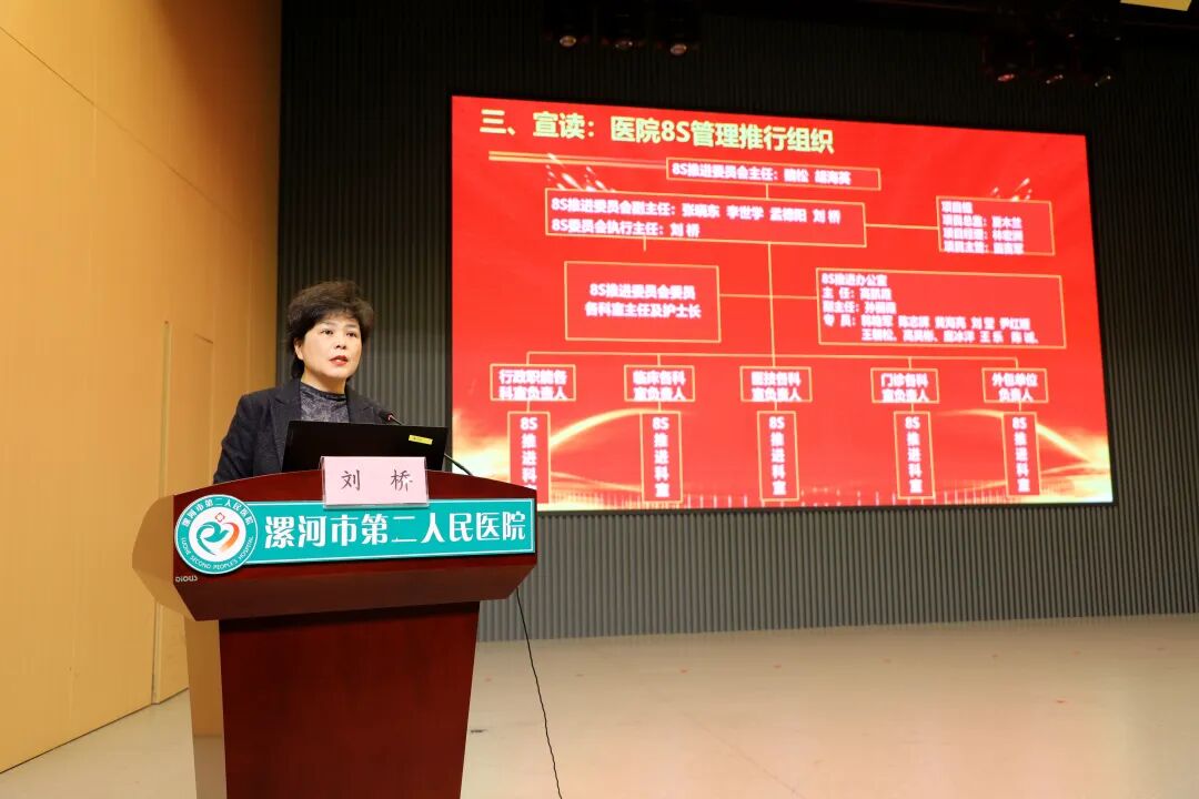 副院長劉橋宣讀了醫院8S管理目的與推行組織架構,通過明確管理目標與責任分工,讓全體參會人員清晰知曉8S推行的核心方向與執行體系,為后續工作劃定“路線圖”。