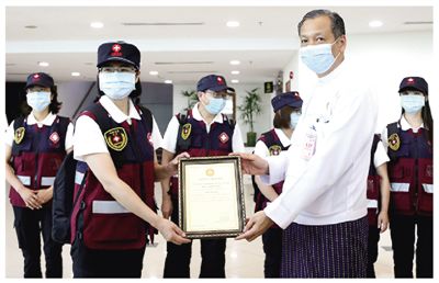 4月22日,在緬甸仰光國際機(jī)場,緬甸衛(wèi)生和體育部醫(yī)學(xué)研究司司長佐丹吞(前右)向中國抗疫醫(yī)療專家組頒發(fā)證書。 |