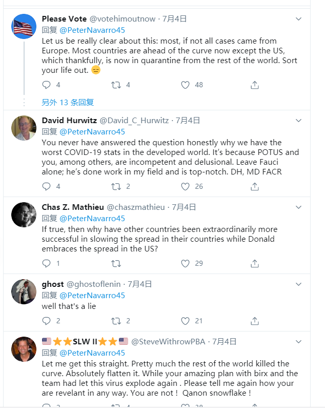 對于美國政客炒冷飯的劇情,觀眾早就不耐煩了。看看納瓦羅親自轉(zhuǎn)發(fā)的推特下收到的一排排留言:“讓我們弄弄清楚:多數(shù)的病例來自歐洲。多數(shù)國家都跑贏了增長曲線,除了美國。現(xiàn)在美國被全世界隔離。先整理好你自己的生活吧。”