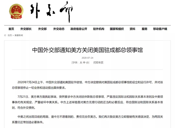 美方無端要求中方閉館的行為,嚴重違反國際法和國際關系基本準則,嚴重違反中美領事條約有關規定,是對中美關系的蓄意損害,是對中美和平發展大局的惡意破壞。