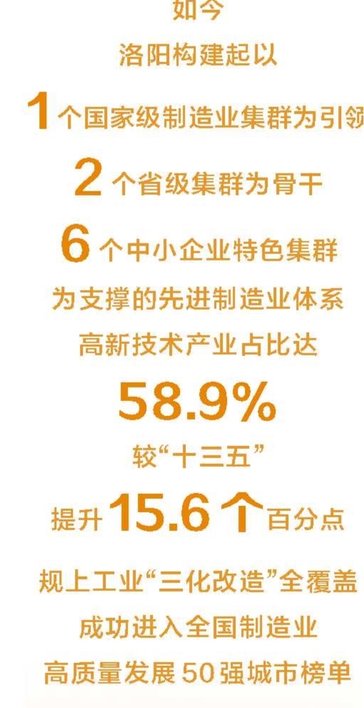 如今,洛陽構建起以1個國家級制造業集群為引領、2個省級集群為骨干、6個中小企業特色集群為支撐的先進制造業體系,高新技術產業占比達58.9%,較“十三五”提升15.6個百分點,規上工業“三化改造”全覆蓋,成功進入全國制造業高質量發展50強城市榜單。