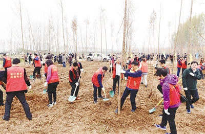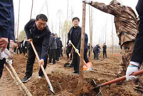 劉尚進、李亦博、李思杰、楊驍、蔣志安、高喜東、周新鶴、張宏進、辛偉、陳平、周學功、栗社臣、余偉、呂娜、徐匯川、閆天常、胡新峰、宗萬志、田冠亭及市中級人民法院院長陳松林、市人民檢察院檢察長陳連東與市直及駐漯各單位主要負責人,市教育、衛生、工商、公安、青年志愿者等社會各界代表600余人,來到沙河國家濕地公園合理利用區內參加義務植樹活動。植樹活動現場一派熱火朝天的景象,有的移苗扶苗,有的揮鍬鏟土,有的踩土壓實,有的拎桶澆水,不大一會兒就植下一片新綠。