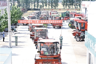 (記者 孫 震)5月23日,在召陵區金土地農機專業合作社門前,伴隨著一陣陣轟鳴聲,一支由76臺聯合收割機、152名農機手組成的“三夏”跨區作業隊浩浩蕩蕩踏上南下征程,拉開我市2023年“三夏”機收跨區會戰序幕。
