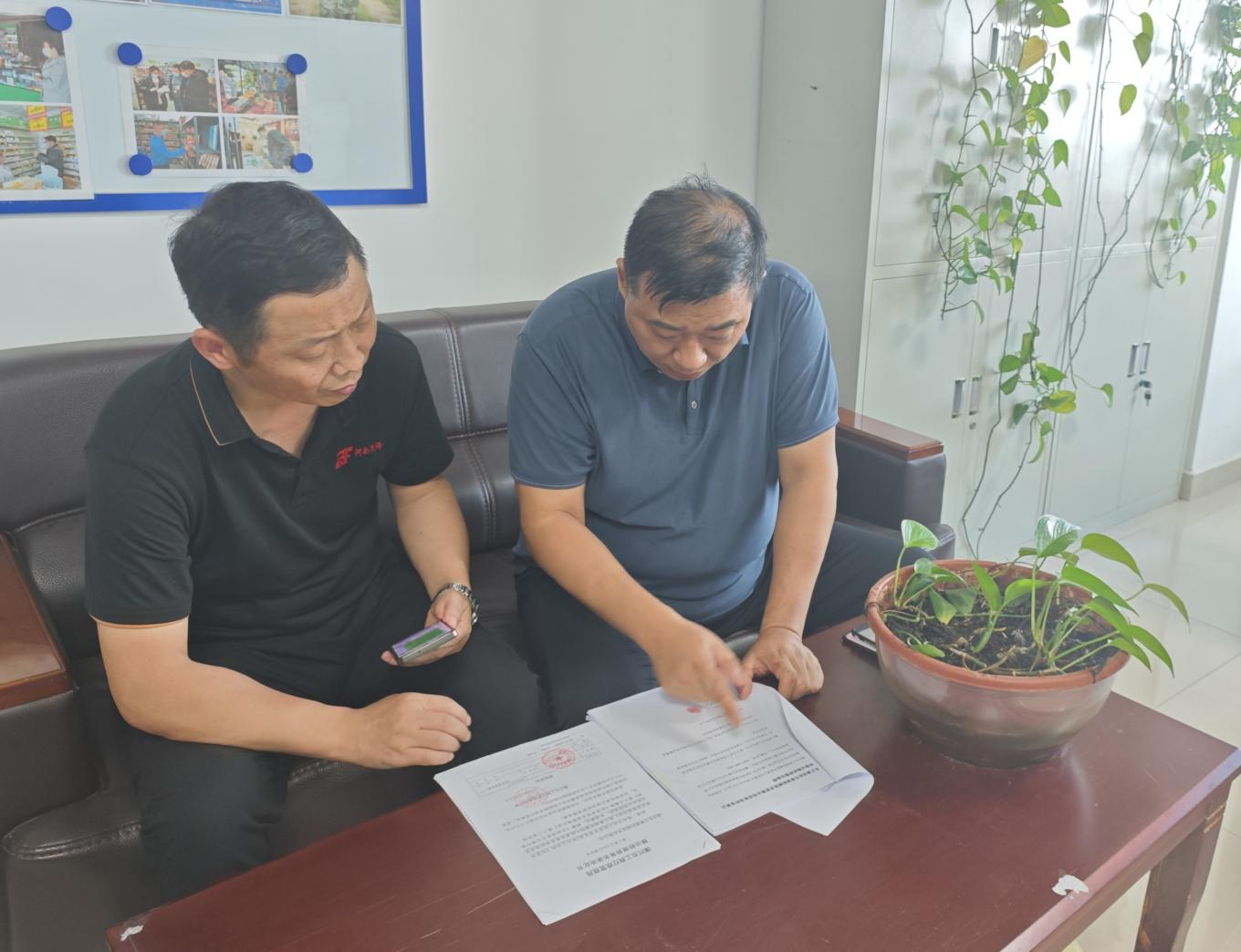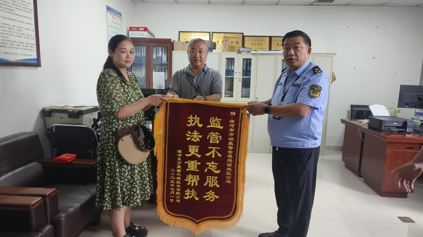 2025年7月7日下午,一名企業工作人員將一面繡著“監管不忘服務、執法更重幫扶”的錦旗送到漯河市市場監督管理局西城區分局執法人員手中,以表達對該局執法人員幫扶企業的感謝之情。