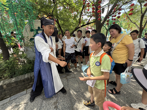 一踏入萬歲山武俠城,古色古香的宋代街巷和建筑便映入孩子們眼簾,仿佛穿越回了千年前的大宋。街道上,鄭記肉鋪、獅子樓、王婆茶莊等實(shí)景店鋪,充滿生活氣息,孩子們好奇地打量著,想象著古人的生活場景。街邊藝人的精彩表演引得孩子們陣陣驚嘆,歡呼聲此起彼伏?!度蜃<仪f》里,逼真的城墻、城門、大炮和烽火臺,激烈的戰(zhàn)斗場面配合影視爆破、云梯炮戰(zhàn)、大型馬術(shù)等實(shí)景拍攝技術(shù),將《水滸傳》中的情節(jié)鮮活呈現(xiàn),孩子們看得目不轉(zhuǎn)睛,被綠林好漢們的江湖豪情深深吸引,演出結(jié)束后,掌聲雷動(dòng)。在萬歲山武俠城內(nèi),孩子們還觀賞了多場精彩絕倫的演出。從《吊環(huán)》的驚險(xiǎn)特技到《大宋奇兵》的英勇無畏,再到《李逵斷案》和《林沖戰(zhàn)楊志》……此外,孩子們還進(jìn)行了一系列互動(dòng)體驗(yàn)活動(dòng)。通過石頭剪刀布、投壺等游戲來賺取銀票,換取自己喜歡的物品。每一場演出都讓孩子們陶醉其中,流連忘返。