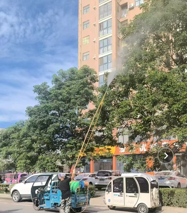 各區、園林成員單位也主動作為,加強對公園綠地、道路綠化帶、居民小區、苗圃等重點區域的巡查頻次,特別關注法桐、女貞、紫薇等易感植物。利用黃板誘集、定點觀測等技術手段,動態監測白粉虱成蟲種群密度、若蟲孵化情況及擴散范圍。采用物理阻隔與誘殺方法,在成蟲高發區域,特別是人流密集的公園、廣場及學校周邊,大規模懸掛黃色粘蟲板,利用其趨黃性進行物理誘殺,有效降低成蟲基數,積極推廣環境友好型防治技術。利用夜間或清晨人車稀少時段,組織專業隊伍使用高射程噴霧車、背負式噴霧器等設備進行精準噴施,重點針對葉片背面(白粉虱主要棲息部位)防治。