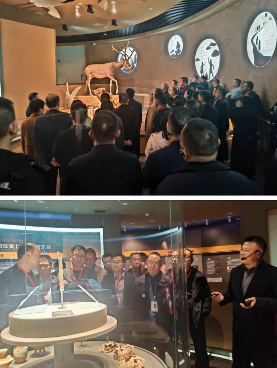 賈湖遺址作為入選“百年百大考古發現”的新石器時代重要遺址,是中華文明起源研究的直接物證,更是中華禮樂文明的萌芽之地。在賈湖遺址博物館,學員們在講解員引導下,先后參觀 “遠古探秘 尋夢賈湖”等六個核心展廳,仔細觀摩距今八千余年的骨笛、成組龜甲器、叉形骨器等珍貴文物,認真聆聽賈湖先民耕種水稻、制作陶器、創制文字的遠古故事。當了解到出土的七孔骨笛可吹奏完備五聲音階,將中國音樂史源頭大幅前移,且契刻符號早于兩河流域楔形文字近4000年時,大家深切贊嘆先民的智慧與創造力。