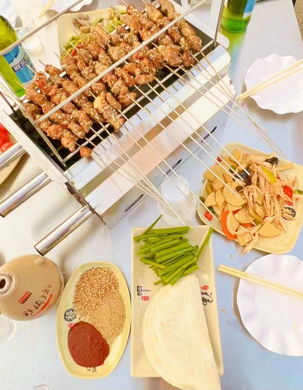 伴著夕陽的余暉,鼓風機在爐頭轟鳴,肉已提前腌過,猛火之上,油脂淋漓,廚師取毛刷蘸醬在肉面簡單一抹,油料肉汁灑在火上,橘色的火舌頭將那肉串舔上七八回,帶著猛烈的葷氣,油脂的香味瞬間四溢開來,將烤好的肉串取下,在蘸料中一滾,餅放在手上,串放在餅上,而后手攥餅將肉從簽子上擼下,將一段小蔥對折,蘸些秘制醬放在餅內,整個悶入口中,享受著滋滋冒油的烤串、碳水以及鮮蔬在口腔的對撞,咀嚼間豐腴醇厚滋味迸發在唇齒間,瞬間喚醒的味蕾把我們帶回鄉土田園的時光,奔赴一場久別的兒時重逢,撩撥起我們內心最柔軟的情感,共繪一副人間煙火畫卷。(通訊員:楊麗麗 張付慶)