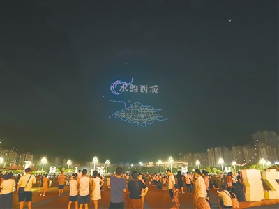 7月11日20時,上千架無人機(jī)騰空而起,先組成“漯河味道”四字,轉(zhuǎn)瞬之間化作奔騰河流與展翅飛鳥,最終組成“水韻西城”字樣。“太壯觀了!”市民舉著手機(jī)驚呼,閃光燈與夜空中的光點(diǎn)交相輝映。市民之家南門前廣場成了光影的海洋。