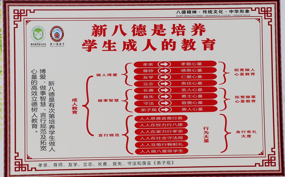 德育是學校教育的靈魂,是學生健康成長和學校工作的保障,德育的質量是學校辦學水平的重要標志之一,把德育擺到優先發展的位置,能讓學生受益一生,得益一世!為此,朱喜洋把“新八德”作為德育教育之基之核,他認為,抓住了“新八德”,就牽住了德育教育的牛鼻子。