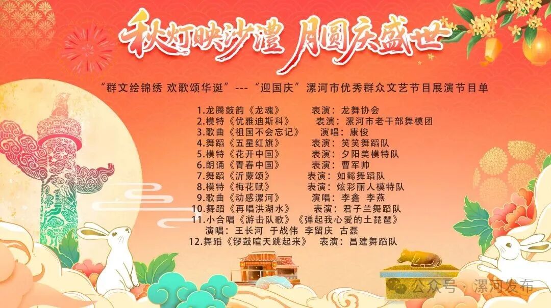 今天19:30,沙澧河風景區紅楓廣場,“群文繪錦繡 歡歌頌華誕”——漯河市迎國慶優秀群眾文藝節目展演,精彩繼續!