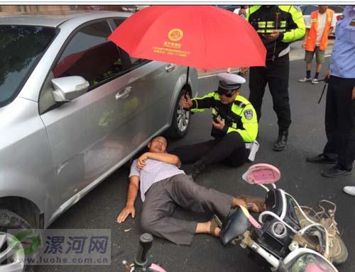 漯河市交警支隊秩序管理示范大隊騎警吳沛洋:當(dāng)時我跟隊友王冰潔巡邏到嵩山西支路的時候,發(fā)現(xiàn)一場車禍,我們立即上去查看,當(dāng)時發(fā)現(xiàn)地上躺了一位六十多歲的老人,經(jīng)過簡單的詢問老人出現(xiàn)了頭暈,胸悶的癥狀,根據(jù)經(jīng)驗確定他有可能是心臟病,因為當(dāng)時天氣溫度較高, 地表溫度可能要達(dá)到四十多度,老人心臟病不能移動,只能平躺,我就把老人的頭稍微抬起來一點,由于沒有支撐點,情急之下我就坐在地上伸出腿,讓老人枕著我的腿,等待120的救援。