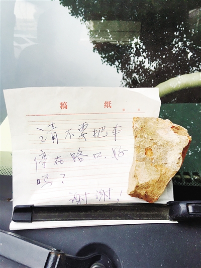 記者注意到,該車(chē)的擋風(fēng)玻璃上有半塊磚頭,磚頭下方壓著一張字條。字條上寫(xiě)著“請(qǐng)不要把車(chē)停在路口,好嗎?謝謝!”