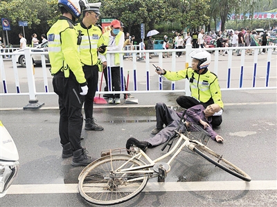 當天上午11點20分,一名騎自行車的老人在淞江路與嵩山路交叉口附近突然暈倒,正在巡邏的騎警王孟召和2名同事恰巧路過。