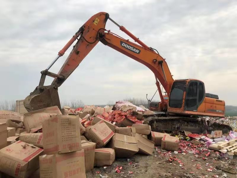 展示活動(dòng)結(jié)束后,一箱又一箱的假冒偽劣商品被運(yùn)輸?shù)绞欣盥駡?chǎng)進(jìn)行集中銷毀。一輛鏟車在轟鳴聲中進(jìn)入銷毀現(xiàn)場(chǎng),對(duì)現(xiàn)場(chǎng)堆積的假冒偽劣商品進(jìn)行反復(fù)碾壓,壓碎后再將垃圾進(jìn)行統(tǒng)一的無(wú)害化處理。