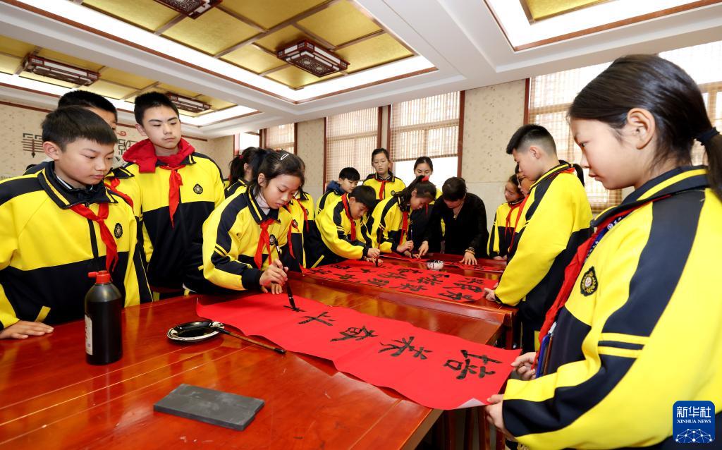 2月17日,在山東省棗莊市東湖小學(xué),愛好書法的學(xué)生向同學(xué)們展示在寒假期間學(xué)到的書法技藝。