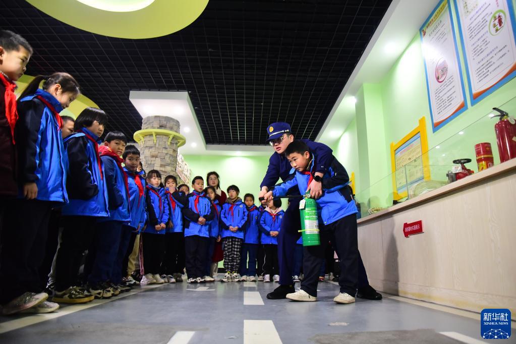 2月17日,浙江省建德市壽昌第一小學(xué)開展“安全教育 牢記于心”為主題的開學(xué)第一課消防安全知識(shí)教育活動(dòng)。這是消防員在消防科普體驗(yàn)館里向?qū)W生講解如何正確使用滅火器。
