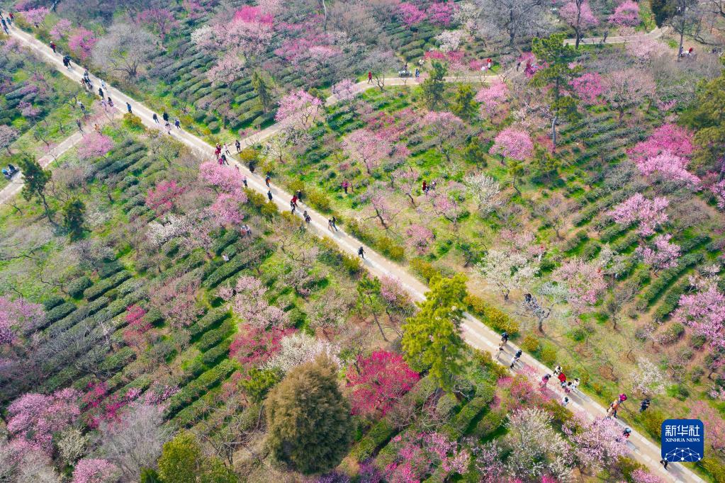 2月16日,游人在南京梅花山賞花(無人機照片)。