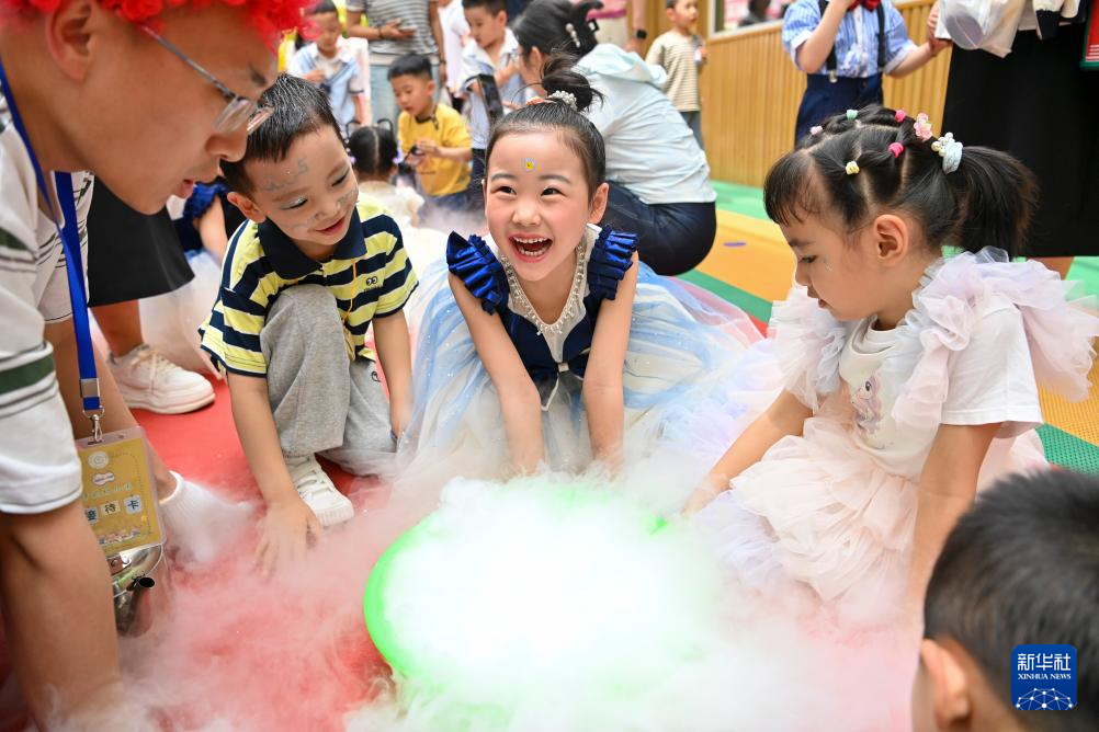 5月30日,山西省太原市迎澤區師苑幼兒園的小朋友在慶祝“六一”主題活動中觀看干冰實驗。