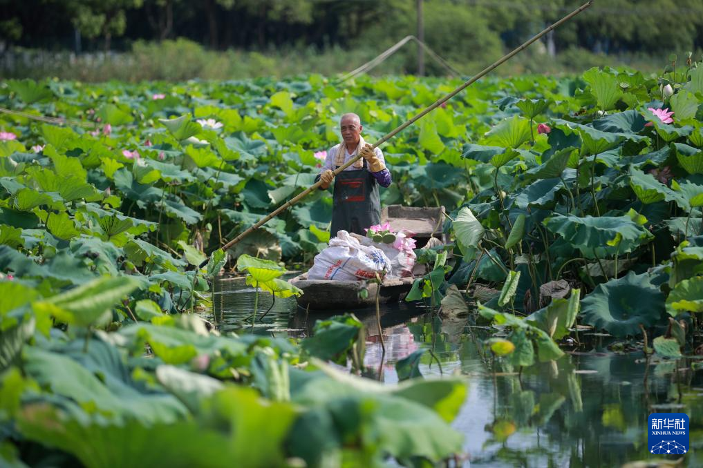 8月7日,農民在浙江省湖州市吳興區埭溪鎮官澤村采摘荷花和蓮蓬。