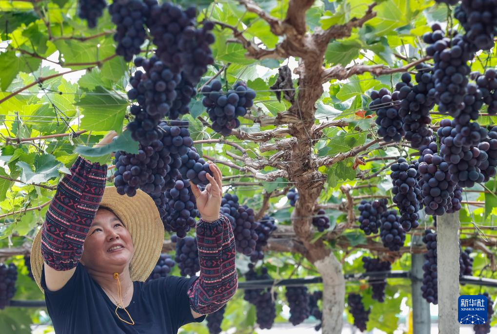 8月7日,果農在江蘇省句容市白兔鎮倪塘村一家葡萄園采摘葡萄。