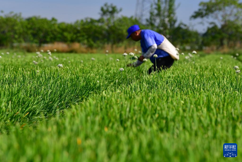 8月7日,采摘工在江蘇省無錫市惠山區玉祁街道一處蔬菜種植基地采摘韭菜花。