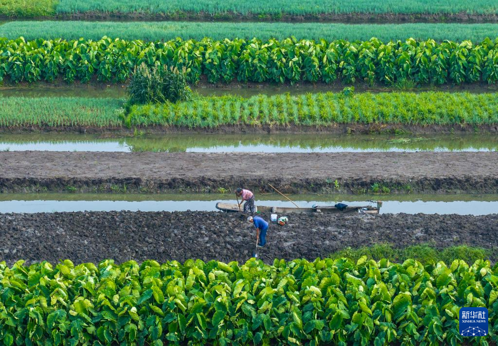 8月7日,農民在江蘇省興化市垛田街道高家蕩村的田間勞作(無人機照片)。