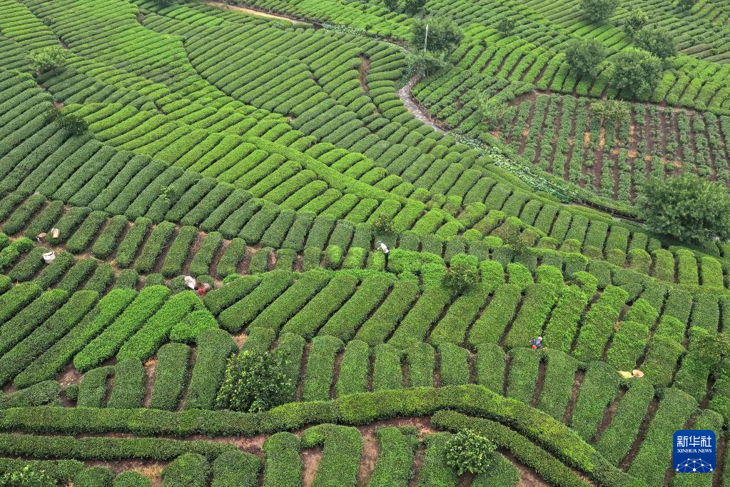 8月7日,茶農在三峽庫區湖北省宜昌市秭歸縣茅坪鎮松樹坳村一茶園采摘秋茶(無人機照片)。